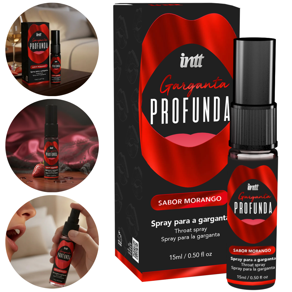 A prática do sexo oral profundo pode ser ainda mais prazerosa com o uso do Spray Garganta Profunda Intt, agora com o delicioso sabor de morango. Sua fórmula refrescante e suavemente dessensibilizante reduz o desconforto, diminui a ânsia e proporciona uma sensação agradável na boca e garganta.