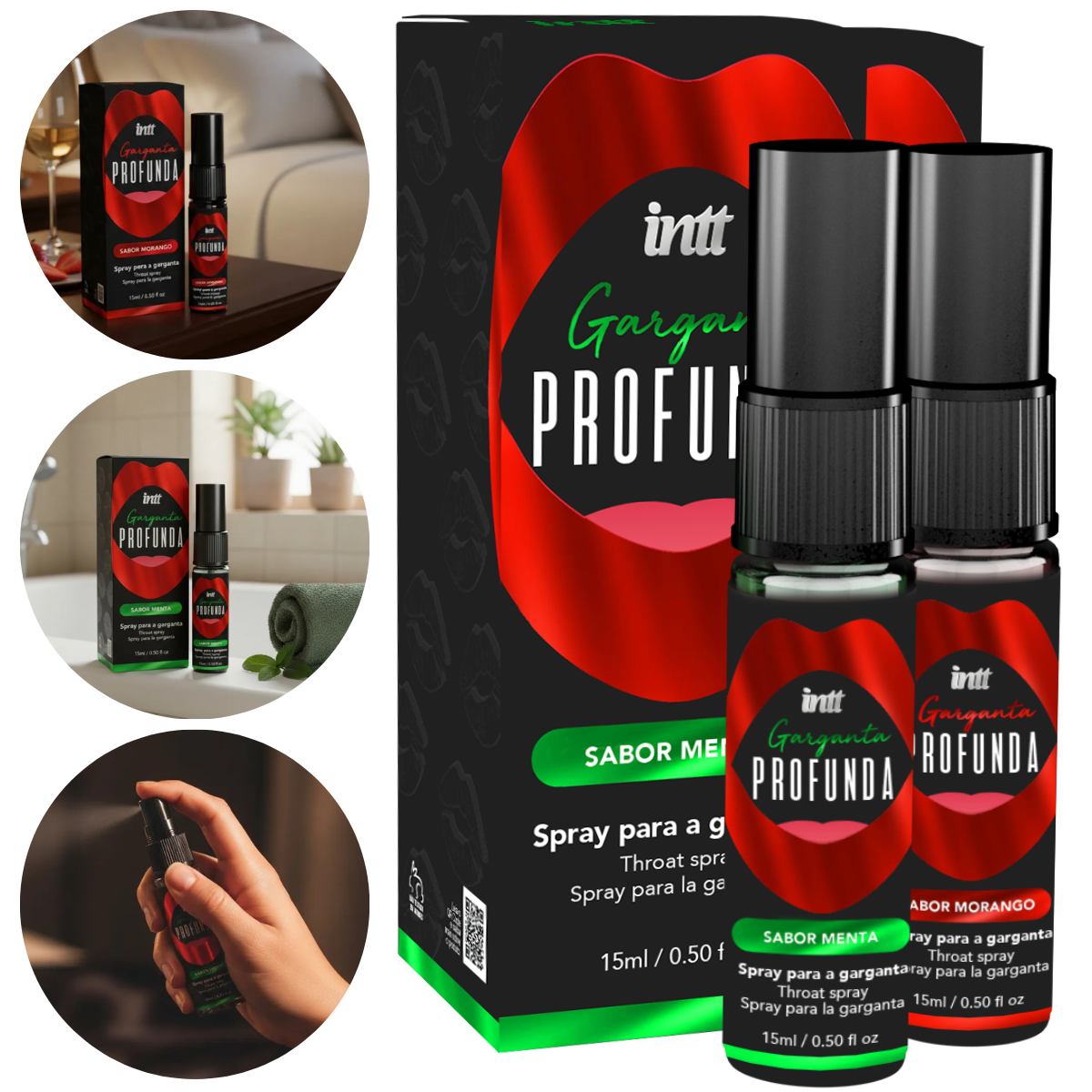 A prática do sexo oral profundo pode ser ainda mais prazerosa com o uso do Spray Garganta Profunda Intt, agora com o deliciosos sabores de morango e menta. Sua fórmula refrescante e suavemente dessensibilizante reduz o desconforto, diminui a ânsia e proporciona uma sensação agradável na boca e garganta.