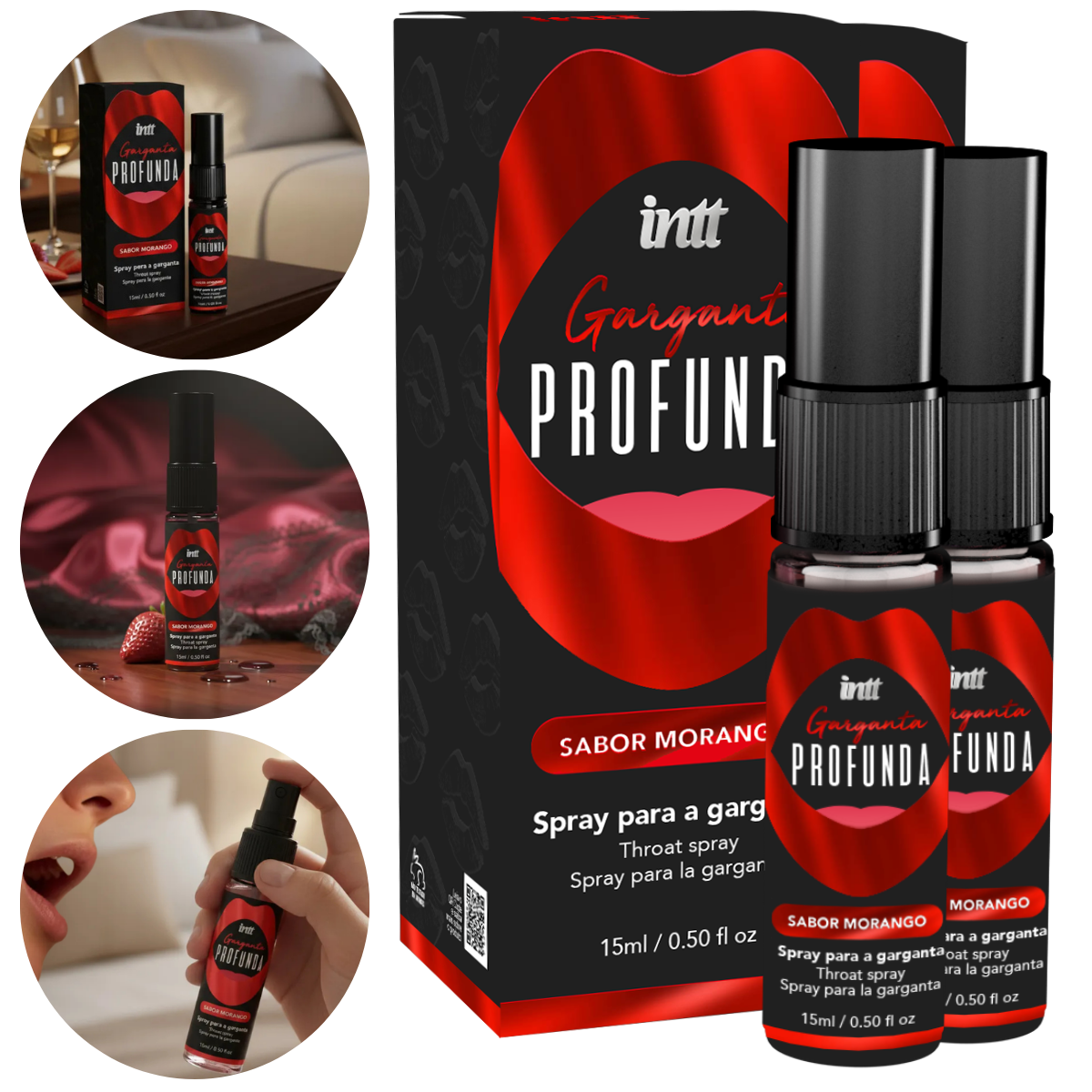 A prática do sexo oral profundo pode ser ainda mais prazerosa com o uso do Spray Garganta Profunda Intt, agora com o delicioso sabor de morango. Sua fórmula refrescante e suavemente dessensibilizante reduz o desconforto, diminui a ânsia e proporciona uma sensação agradável na boca e garganta.
